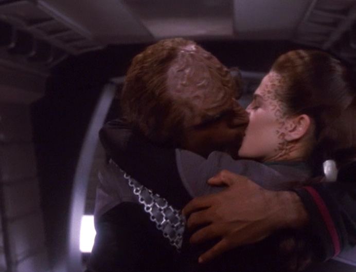 First of all, it’s weird — and clearly contrived — that Dax was left behind in command of the station. The more natural and common thing would have been to have Kira on DS9 and Dax on the Defiant with Sisko. But then, Dax wouldn’t be on the station when Dukat arrived and wouldn’t be caught in the crossfire.