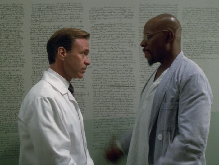 Part one: Odo’s back on DS9, and he’s not doing well. Bashir and O’Brien, acting on their plan from “Tacking into the Wind”, lure Sloan (William Sadler) from Section 31. Once they capture him, he triggers a suicide implant, so Bashir and O’Brien use Romulan mind probes to enter his dying mind — which, conveniently, looks like DS9 — to see if they can find the cure to the Changeling disease (bah). The plan generally works, through a bunch of Voyager-style nonsense. But Bashir has to choose between getting all the secrets of Section 31 from Sloan’s mind or escaping in time to save Odo. Or something. What a mess of an episode.