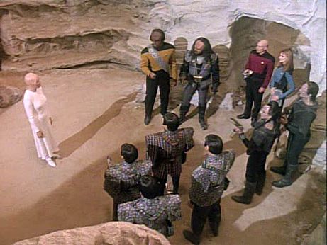Picard’s former archaeology professor and mentor, Galen (Norman Lloyd) asks Picard to join him on a super-secret mission. It would mean leaving the Enterprise, so Picard passes, and a disappointed Galen moves on. He is later killed when his shuttle is attacked, and Picard takes on the mysterious mission — which seems to be aimed at gathering DNA fragments from various worlds. Soon, the Klingons and Cardassians are involved (they apparently learned of Galen’s mission) and Picard gets the two rivals to work together. After some prerequisite deception — the Cardies try to sabotage the Enterprise and the Klingon captain (John Cothran) tries to bribe Data — they all end up on a lifeless planet, where the last remaining DNA fragment is found. Then, the Romulans show up — they’d been shadowing the Enterprise — and a faceoff appears imminent. As the parties squabble with weapons drawn, Picard and Crusher extract the DNA and it activates an ancient hologram (Salome Jens) who tells the group that long ago her people spread their genetic material throughout space — possibly creating the bipeds we see all over Trek and hinting at the possibility that the races are somewhat related. The Klingons and Cardassians are unmoved, but the episode ends with the Romulan commander contacting Picard, saying perhaps they’re not that different after all.