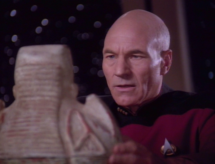 Complaints aside, I still really love this episode. It’s Picard at his best, and the guest actors are really pretty great. It’s interesting that Salome Jens shows up here as the female in the holographic projection, considering her next role is as DS9’s worst villain, the female Changeling. If this were further in Trek history — the Dominion doesn’t really pop up for another year or so — one might wonder if this were just an elaborate Dominion trick. 🙂