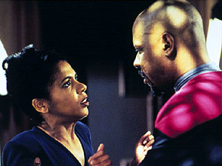 The Federation is sending a bunch of heavy-duty replicators to Cardassia to help rebuild the battered empire following the Klingon invasion. Eddington is leading the efforts and he and Odo tell Sisko that they suspect that his new main squeeze, Kasidy Yates (Penny Johnson) is smuggling goods to the Maquis on her freighter — something they confirm by following her ship to the Badlands in a cloaked Defiant. They plan to arrest her and the Maquis on their next trip — a big part of the episode is Sisko not wanting to arrest her — but the Defiant lies in wait as Kasidy’s ship waits for hours for a rendezvous. It turns out the whole thing with Kasidy was a ploy by the Maquis, specifically Eddington, who has defected(!),to get Sisko and most of the senior staff off the station to steal the replicators. Sisko leaves Kasidy’s ship behind to try to catch Eddington, but he’s too late. Eddington contacts Sisko and gives him a blistering speech about his reasoning, and Sisko vows to hunt down Eddington, even if it takes the rest of his career. Kasidy returns to the station to face the music and tells Sisko she’ll return to him after some time in prison.