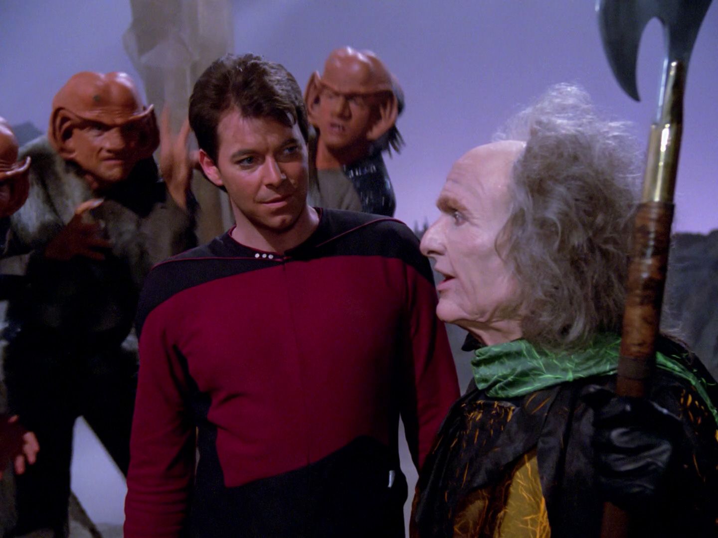 It’s been said that early TNG isn’t just bad TNG. It’s more like bad TOS. This episode could have fit right into the original series, with Riker playing the part of Kirk on the surface, leading the fight scenes against the bad guys. Picard, on the ship, plays the part of Scotty. Later in TNG, the roles are reversed, with Picard and Data taking on the Kirk/Spock roles and Riker often left behind to mind the store. In some ways, this change helped make TNG a better series — but the marginalization of Riker gets pretty ridiculous in the sixth and seventh seasons. More on that in later reviews.