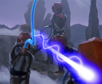 There’s also something odd about the scene where Riker materializes on the planet without the rest of the away team. It’s a really dull scene where he walks around looking for everyone (“Annnyybodddyyyy?!”), eventually finding Geordi and Data. What’s also odd is the way Riker asks who the Ferengi are before they attack. I guess he wouldn’t know their names — but wouldn’t he know that they’re the Ferengi away team?