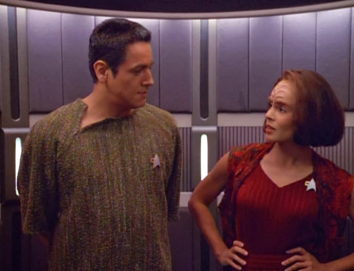 The previous episode, “Resolutions”, involves Janeway and Chakotay contracting a disease on some random planet that they then can’t leave. Voyager departs without them and is actually captained by Tuvok for several weeks. Eventually, the ship gets a cure from the Vidiians (Voyager’s second-tier bad guys in the first two seasons) and recovers Janeway and Chakotay. Then, because it’s Voyager, things are back to business as usual.