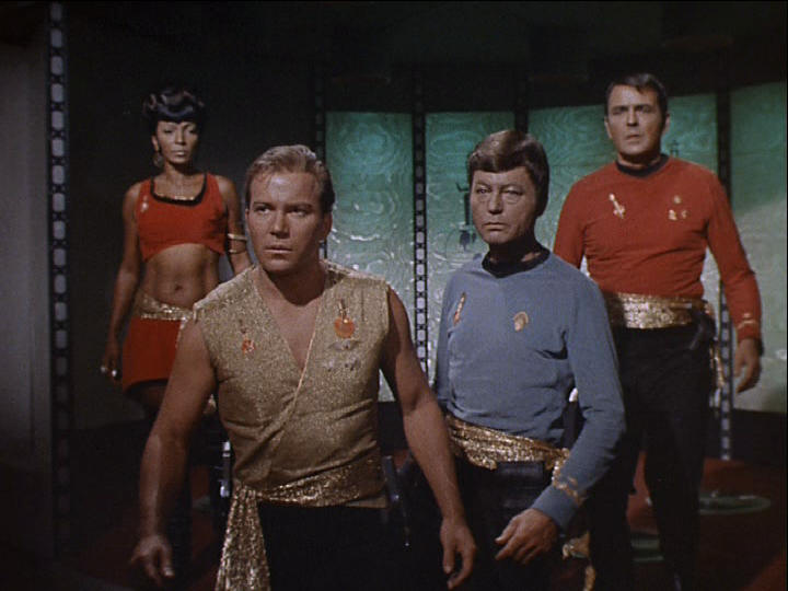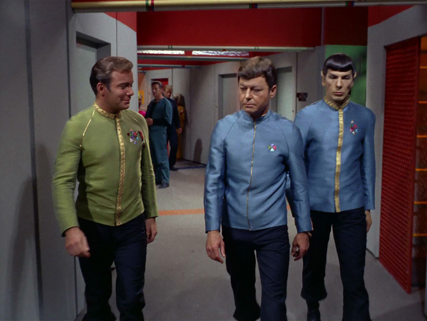 “Mirror, Mirror” is one of the high-concept episodes of TOS that really works. It has the corny TOS trope of the good guys figuring out a problem with nothing more than extemporaneous dialog — “Something … parallel. A parallel universe!” — and it’s not really clear how else they would have made the discovery (especially without Spock there to help). OTOH, this episode might be TOS’s best ensemble piece, and each actor who has much dialog as an evil counterpart — McCoy, Scotty and Uhura’s duplicates don’t do much more than yell — really shines in dual roles. Nimoy appropriately gets a lot of love, but Shatner’s scene as evil Kirk is awesome (“Where’s my personal guard?!”). George Takei, too often relegated to exposition on the bridge, gets a good chance to stretch here as evil Sulu.