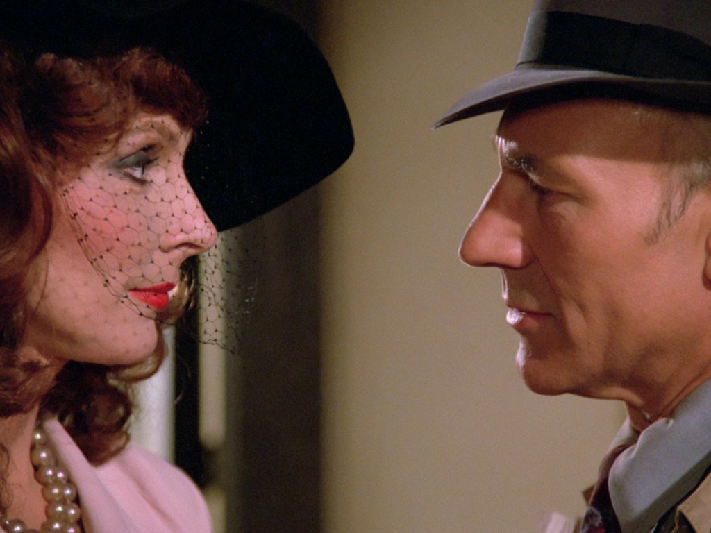 Picard is all stressed as he prepares to give a very elaborate greeting to a very protocol-driven (read: anal) alien species called the Jarada. Troi tells him he needs a break, so Picard checks out the upgraded holodeck — now capable of characters with more human interaction. He chooses to play the role of 20th-century American gumshoe Dixon Hill, a longtime hero. Picard is so amazed with the results after a brief visit that he returns with Data, Crusher and historian/redshirt Whalen (David Selburg). While they’re inside, the Jarada probe the Enterprise, messing up the holodeck, trapping our heroes and removing the safeties. Gangster Cyrus Redblock (Lawrence Tierney) shows up in Hill’s office and shoots Whalen. Realizing they’re cut off from the rest of the ship and in danger, Picard and Co. tell Redblock that they’re actually engaging in a simulation and — after Wesley and Geordi fix the holodeck — Redblock and one of his toadies exit (looking for new plunder) only to disappear. Data and Crusher then hurry Whalen to sickbay and Picard has a short discussion with a non-bad holodeck character who wonders whether his world will continue after Picard leaves. Picard tells him he honestly doesn’t know and heads to the bridge — where he does the weird Jarada greeting successfully.