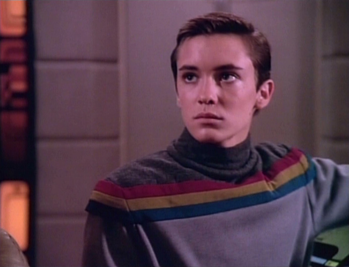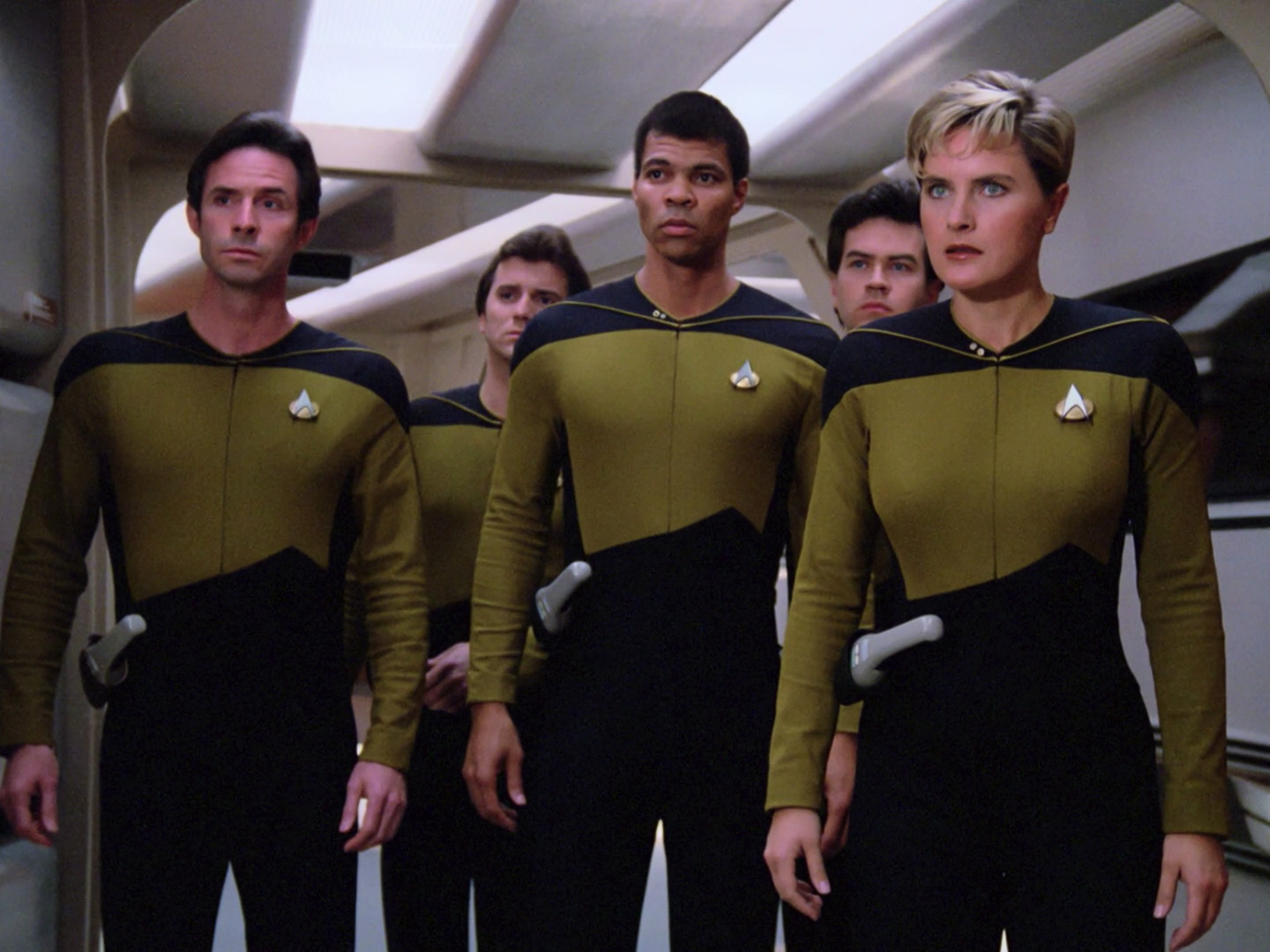 Simply put, having everyone in that scene was weird. Later TNG might have Picard telling Riker or Data or Troi about his adventure. But there’s no way Picard in the fourth or fifth season would take time away from the Jarada briefing for something like this. And there’s no reason for Wesley (who’s usually only in briefings in the series when he’s working on something with Geordi) to be in the scene. Wesley’s involvement later in rescuing Picard and Co. still could have happened.