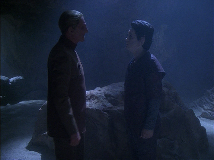Oh, and it was a nice bit of continuity that the Cardassian contact Odo leaves to see was likely the guy we saw in the shadows way back in “Improbable Cause”, as the cave for both meetings appears to be the same.